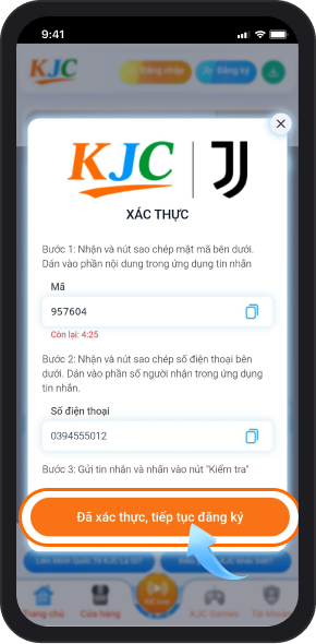 Bước 3: Dùng SĐT đăng ký tài khoản gửi tin SMS đến SĐT hệ thông cung cấp cước phí miễn phí. Nội dung tin nhắn là mã xác thực 6 số điền mã xác thực đó và ấn “Kiểm Tra”.
